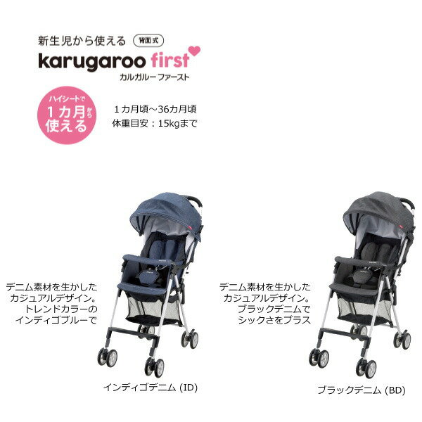 おでかけしたくなる軽さ 新生児から使えるA型ベビーカー【karugaroo first】 対象月齢/1カ月頃?36カ月頃 体重目安/15kgまで サイズ/ 44.5×84×106H(cm) 折りたたみ時:44.5×36×103H(cm) 製品重量/3.7kg 材質/アルミ、ポリエステル、ポリプロピレン、他 座面幅/32.5(cm) シート高さ/51(cm) バスケット容量/18L(耐荷重/5kg) SG基準適合(製品安全協会A型SG合格品)●お支払い方法で代引きはできません。