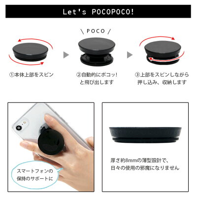 (※凹凸のある素材や、ガラス素材、のスマホケースには対応しておりません)使いたい時にポコッと飛びだす、便利なスマホグリップです。