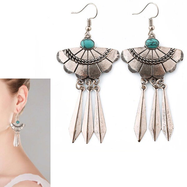 扇型のモチーフに天然石風のターコイズビーズをセットし、刀のようなチャーム3つが揺れるステンピアス。