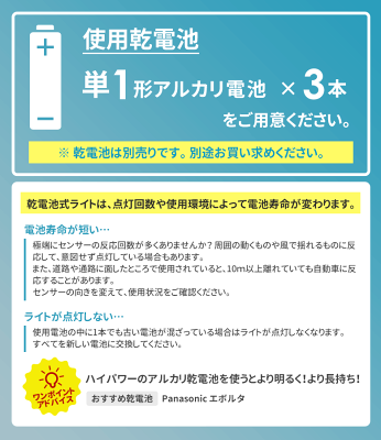 ≪ 商品詳細 ≫ < 仕様 > 【サイズ】高さ80×幅175×奥行175mm 【重量】350g(乾電池、リモコン除く) 【付属品】リモコン・ボタン電離CR2025・ステンレスバンド(1m)・取り付けネジ×2・コンクリート用プラグ×2 【電球 ※1】 8.5W(高輝度白色LED 設計寿命4万時間) 全光束480ルーメン(強) 【使用乾電池】単1形アルカリ乾電池×3本(別売) ※市販の単1形充電池でも使用可能です。